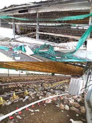 הלחימה בדרום הארץ לא פסחה גם על ענף הלול. פגיעה ישירה של קסאם בלול עלומים גרמה לנזק רב למבנה, ציוד וללהקה שהיתה לפני שיווק. התמונות צולמו ע"י רפי בביאן.