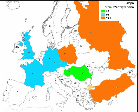 במהלך שנת 2007, נרשמו 66 מוקדים של שפעת העופות במדינות אירופה, לפי הפרוט הבא: צרפת- 3; גרמניה- 6; בריטניה- 3; פולין- 10; צ'כיה- 3; רומניה- 1; רוסיה (אירופה)- 21; טורקיה- 17; הונגריה- 2. מצורפת מפה המפרטת את התפלגות המקרים.