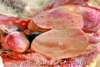 נתיחה: הפגיעות בכבד הן קשות ודומיננטיות בכלל העופות שנבחנו. כבד מוגדל, פריך, צהוב עם מוקדים המורגיים ובחלקם נקרוטיים. כליות נפוחות, בחלק מהעופות שומן צהוב ("צהבת"), הידרופריקארד. מח עצם נבחן ונמצא תקין.
