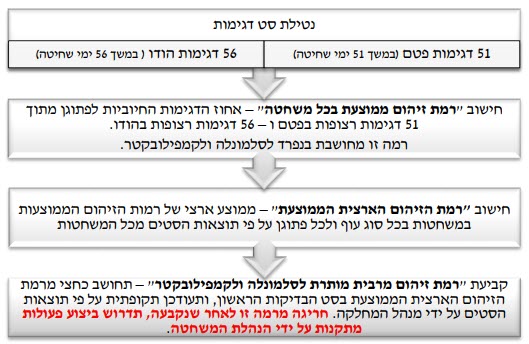 היקף הבדיקות הנדרש הוא: קבוצת מדגם של 51 דגימות פטם (ימי שחיטה רצופים) או 56 דגימות הודו; הבדיקה היא איכותית בלבד ולא כמותית.