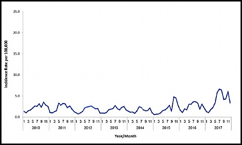 שנת 2017, הסתיימה בעלייה חדה באירועי סלמונלה בבני אדם בישראל. הנתונים השנתיים מצביעים על עלייה חדה בהשוואה לשנים קודמות (נתונים מוצגים משנת 2010). התרשים המצורף, מציג את שיעור הבידודים של חיידק הסלמונלה ל-100,000 תושבים במעבדות הניטור. מינואר 2010 ועד דצמבר 2017. שיעורי התחלואה הנצפים גבוהים יחסית לאלו שנמצאו בתקופות זמן מקבילות בשנים קודמות. לאורך שנת 2017, שני טיפוסים סרולוגים בולטים: סלמונלה אנטריטידיס וסלמונלה אינפנטיס. בחודש יולי 2017, שיעור בידודי חיידק הסלמונלה אנטריטידיס מכלל בידודי הסלמונלה הגיע לכ- 70% מכלל הבידודים. השיעור הגבוה ביותר מבין נתוני הניטור המוצגים מאז ינואר 2011.
