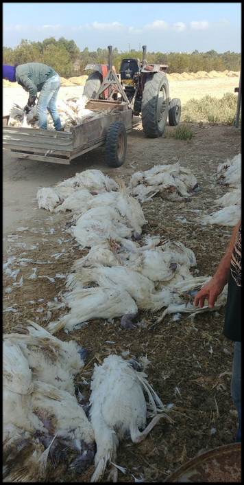 קרוב ל-1,000 תרנגולי הודו מתו בקיבוץ עין השלושה לאחר ששריפה שהתלקחה, בעקבות עפיפון תבערה מרצועת עזה, גרמה לעשן סמיך שהוביל לחנק של העופות.התמונה מטה באדיבותו של ד"ר יריב עגור.