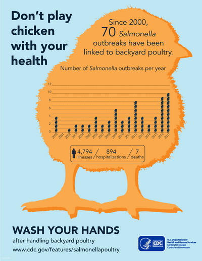 עיקר הדיווחים נקשרים למגע עם אפרוחי תרנגולות או אפרוחי ברווזים. מאז שנת 2000, דווחו בארה"ב 70 התפרצויות של סלמונלה, שמקורן עופות חצר.