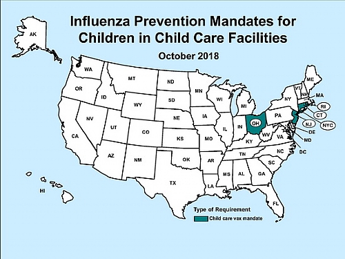 מפת המדינות/ערים בארה"ב, המחייבות חיסון שפעת בגני הילדים