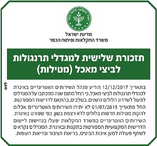 מה-1 ליולי משק הטלה שלא יעמוד בדרישות של רצפות קשיחות במפרט שנדרש ע"י השו"ט, לא יוכל לאכלס את משק ההטלה בפרגיות צעירות.