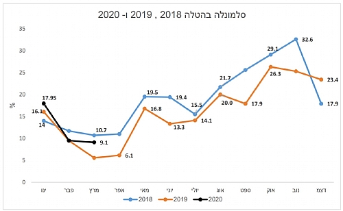 בגרף מטה אנו רואים את אחוז הלהקות החיוביות לסלמונלה כללי, לפי חודש בשנים 2018-2020.