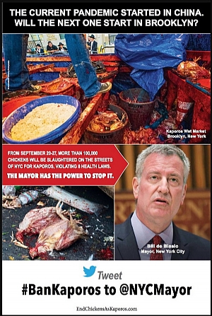 ברחובות העיר ניו-יורק פורסמו מאות פוסטרים הקוראים לאסור את מנהג הכפרות השנה, במיוחד לנוכח מגיפת הקורונה.