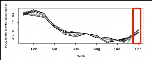 תוך שימוש בדיווחים שהועברו ל-OIE בין השנים 2005 ל-2019 על ידי 76 מדינות שנפגעו משפעת העופות, סך הכל 18,620 התפרצויות בעופות, בוצע ניתוח מגמות כדי לראות האם קיים דפוס עונתי למחלה.