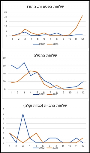 ריכזנו לפניכם מגמות אירועי ניוקסל בישראל לפי חודש בשנת 2023 בהשוואה לשנת 2022.הנתונים באדיבות המעבדות של המועצה לענף הלול, ד"ר ענת וייסמן.ריכזנו את השלוחות המסחריות לבשר בגרף אחד, רביה קלה וכבדה באחר ושלוחת ההטלה בנפרד.