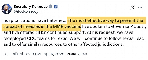 מקרה מוות שני של ילדה בטקסס מחצבת. שני מקרי המוות, כמו גם עיקר מקרי התחלואה הם בילדים לא מחוסנים. שר הבריאות האמריקני, רוברט פ. קנדי, הידוע בעמדתו נגד תרכיבים בכלל ונגד תרכיב MMR בפרט, השתתף בהלוויתה של הילדה בת ה-8 ועודד אנשים להתחסן נגד המחלה.