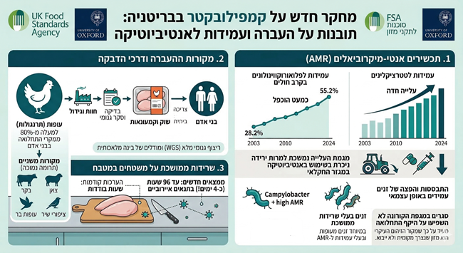 מחקר מקיף שפורסם על ידי הסוכנות לתקני מזון (FSA) בבריטניה, בשיתוף אוניברסיטת אוקספורד ומוסדות מחקר נוספים, מספק תובנות חדשות באשר לדרכי ההעברה ולדפוסי העמידות לתכשירים אנטי-מיקרוביאלים של חיידק הקמפילובקטר (Campylobacter), הגורם השכיח ביותר להרעלות מזון חיידקיות בבריטניה. במסגרת המחקר נעשה שימוש בריצוף גנומי מלא (WGS) ובמודלים מבוססי בינה מלאכותית לניתוח אלפי בידודים שמקורם בחולים ובשרשרת הייצור החקלאית-תעשייתית. הממצאים מצביעים על כך שלמעלה מ-80% ממקרי התחלואה בבני אדם מקורם בעופות, ובעיקר בתרנגולות, שיעור שנותר יציב חרף מאמצי התעשייה להפחית את רמת הזיהום במשחטות. לצד זאת, נמצא כי גם מקורות משניים, כגון בקר, צאן, עופות בר וציפורי שיר, נושאים זנים בעלי פוטנציאל הדבקה לבני אדם, אם כי תרומתם הכוללת נמוכה משמעותית.